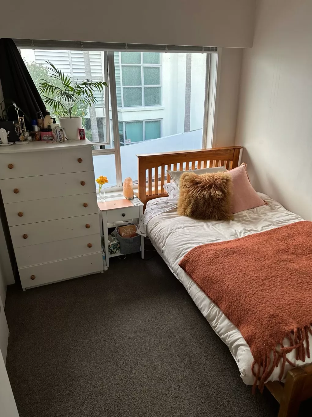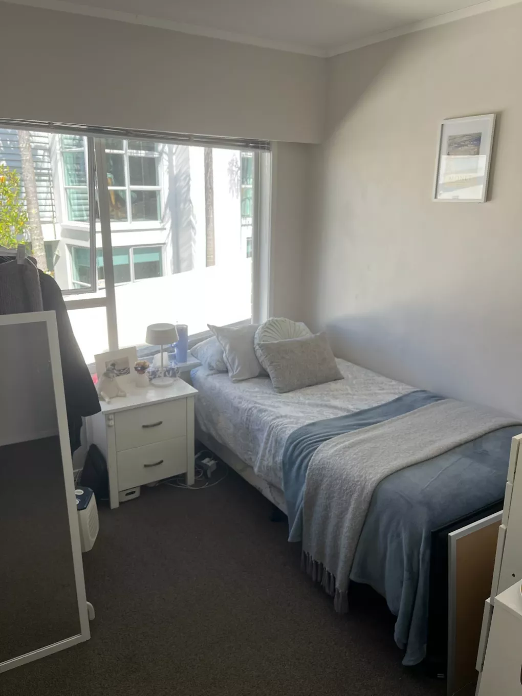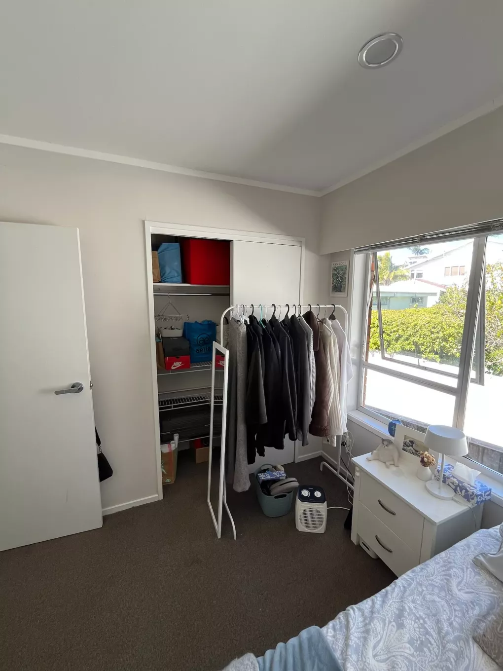 We have a small, unfurnished room available that would easily fit a king single and some drawers or a desk. It also has a built-in wardrobe with shelving. The flat is spacious, with a deck perfect for summer hangs and drying washing. It is a 5-10 min walk to Milford beach, Milford shops, and nearby bus stops. There are 2 cats that live here as well 😊