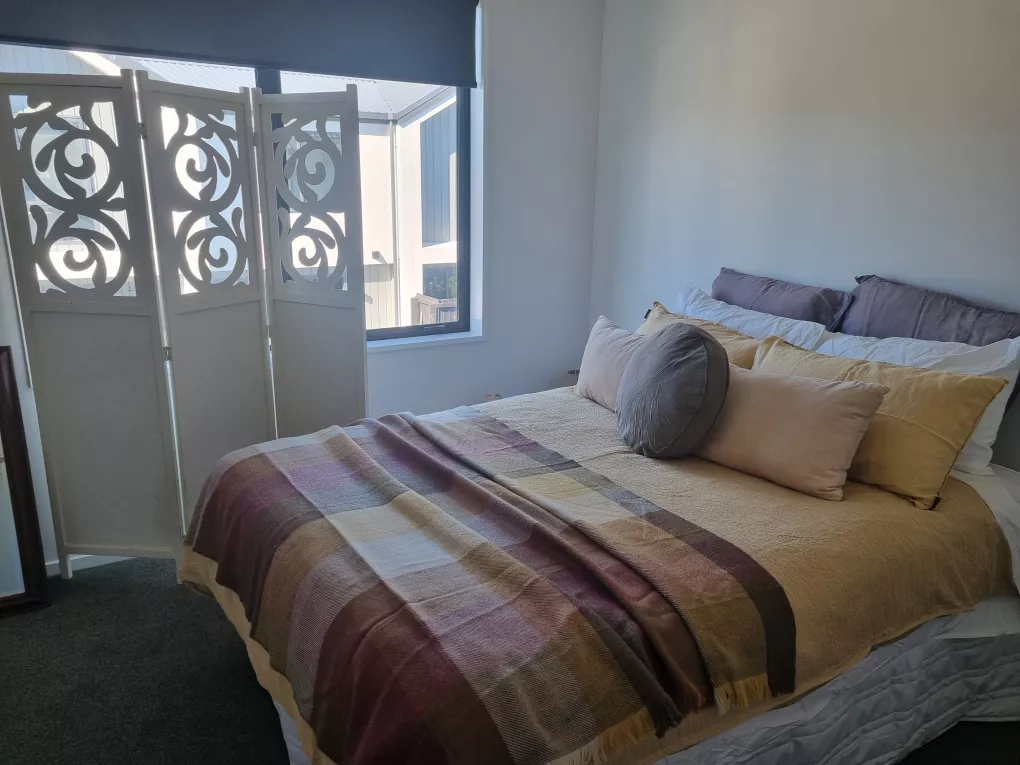 The property is a 3-year-old, modern 2-bedroom townhouse, fully furnished, clean, and tidy. 1.5 bathrooms (shared bathroom). Bedroom includes a double bed and large built-in wardrobe.